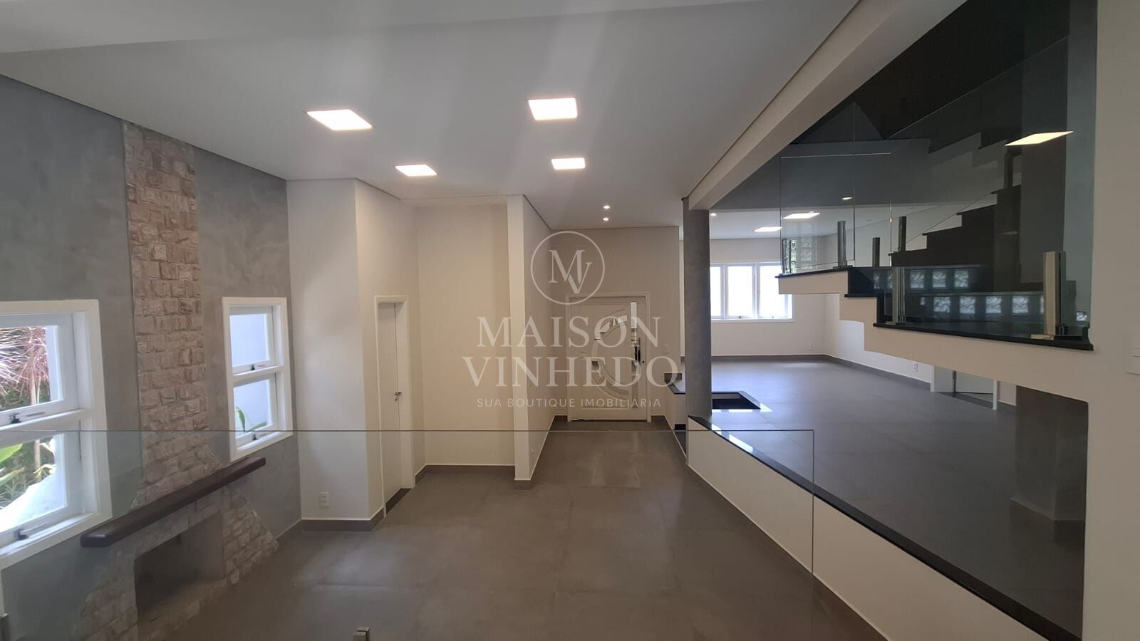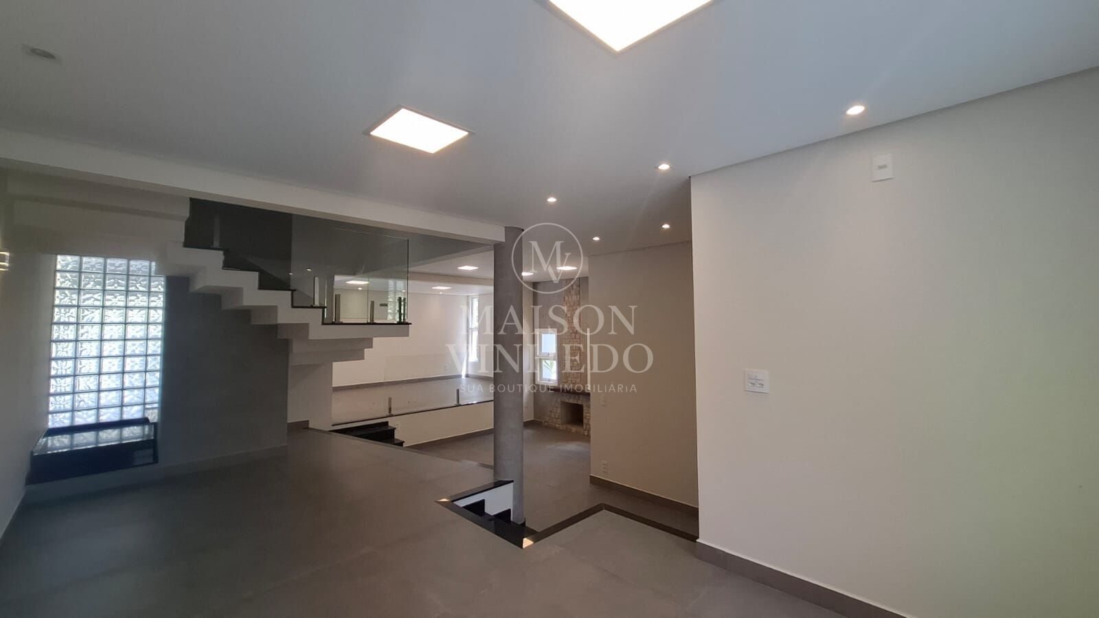 Ao entrar, a área social impressiona pela amplitude e integração. Sala de estar, sala com lareira e generosa sala de jantar se conectam de forma fluida, criando um ambiente acolhedor e sofisticado. Grandes portas de vidro promovem total integração com a área externa.