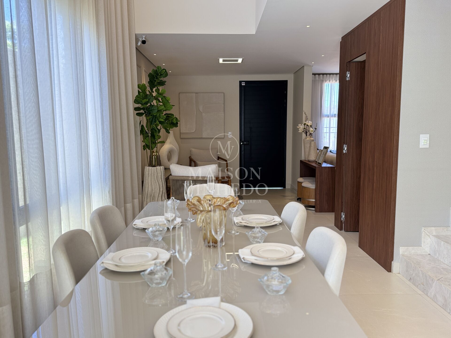 No pavimento térreo, os ambientes se integram de forma fluida e funcional. O living permite a composição de três espaços — estar, TV e jantar — formando uma área social ampla e acolhedora. A cozinha apresenta excelente potencial de integração com balcão ou bar, enquanto lavabo, lavanderia e espaço gourmet com churrasqueira e banheiro externo complementam a praticidade do dia a dia. A residência conta ainda com duas vagas de garagem.