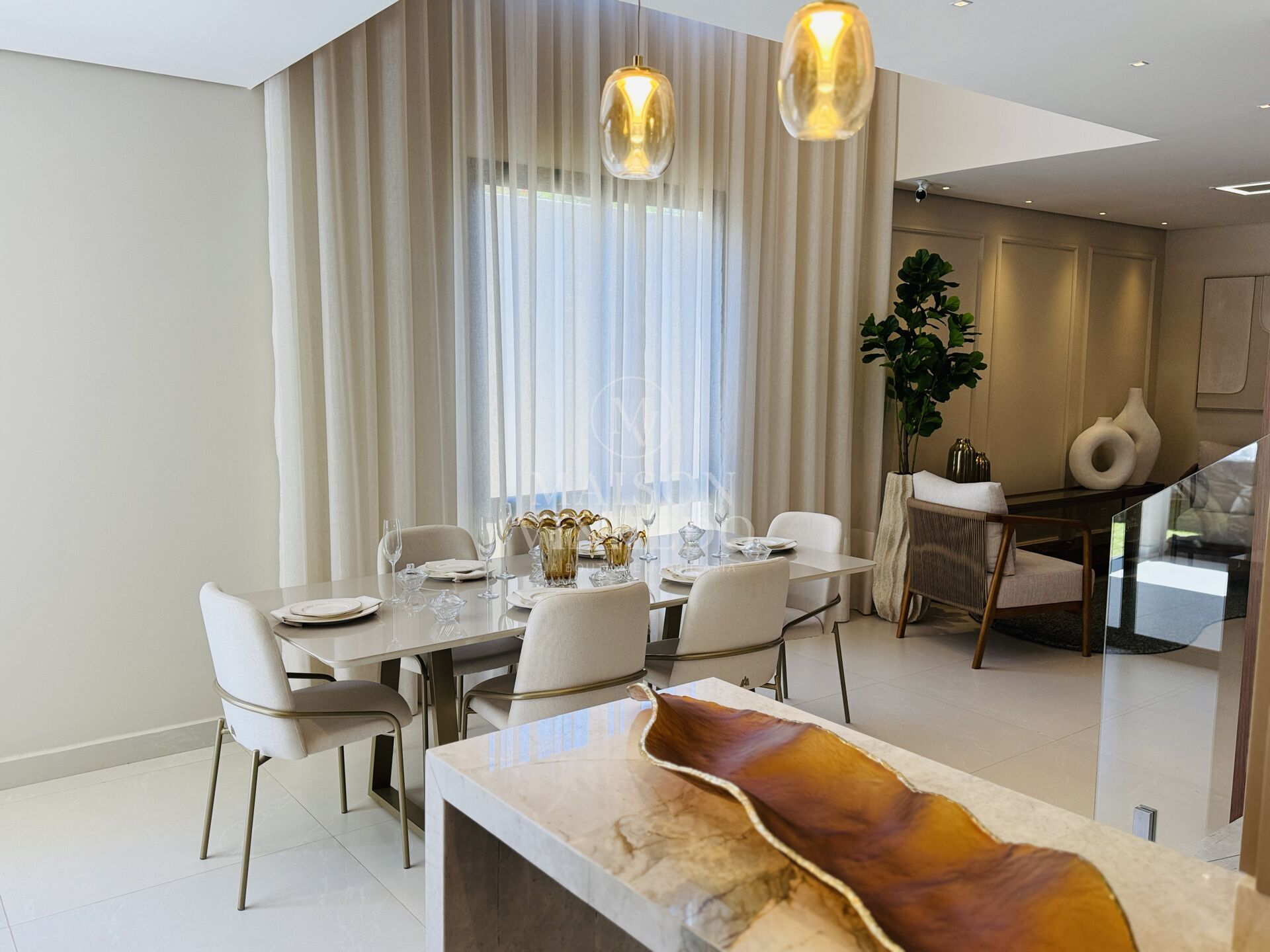 No pavimento superior, o hall com pé-direito duplo reforça a sensação de amplitude. A área íntima dispõe de três suítes confortáveis e bem distribuídas. A suíte master se destaca pelo closet, varanda privativa e banheiro com duas cubas e duas duchas, proporcionando uma experiência diferenciada.