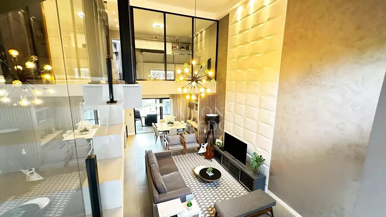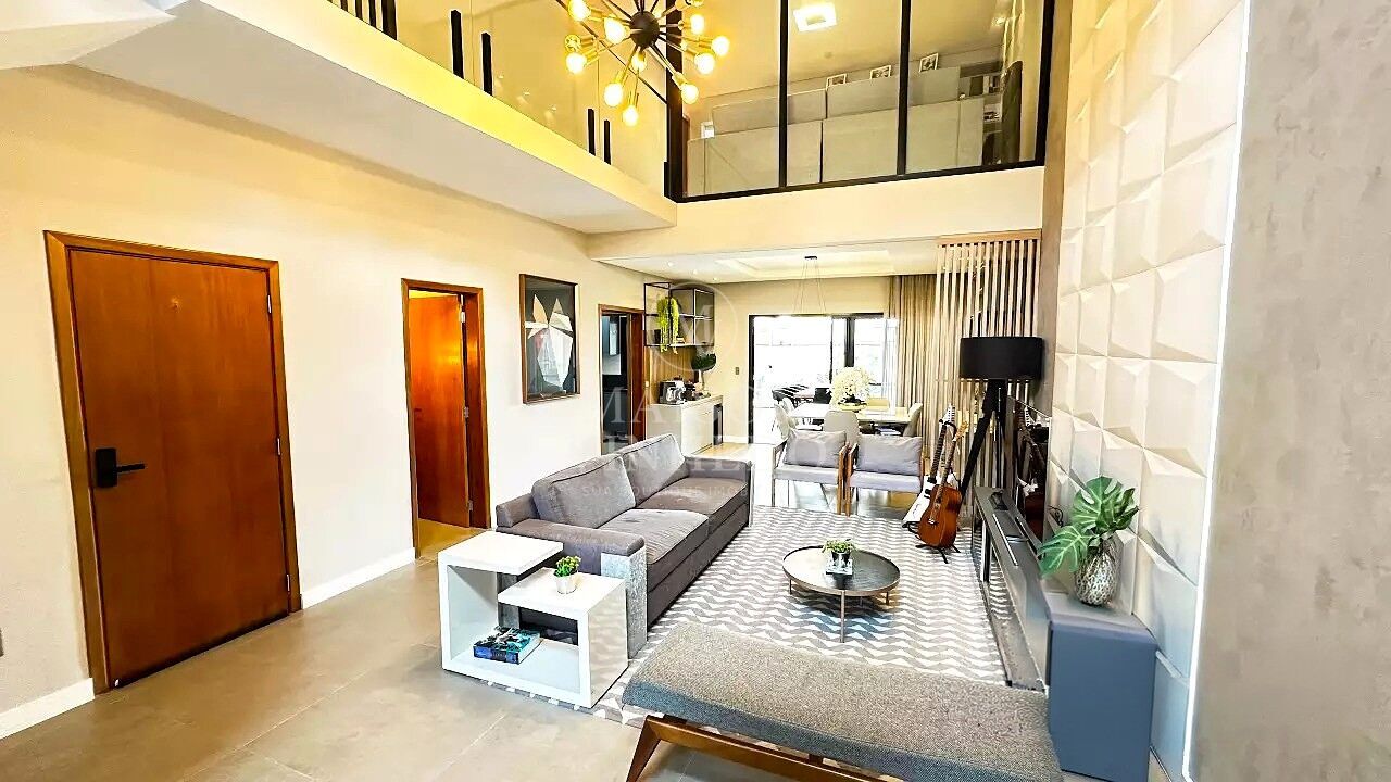 Residência com 3 suítes, pé-direito duplo, espaços amplos e integrados com acabamento de alto padrão.